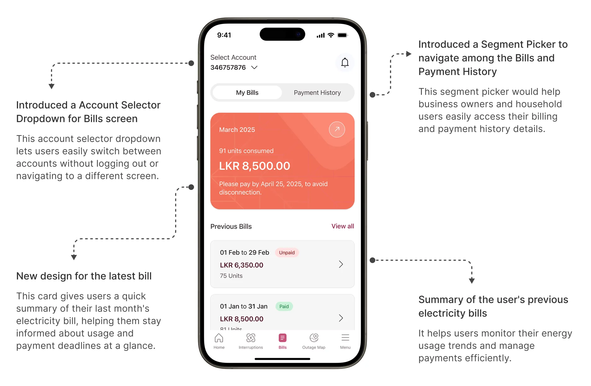 Here are the proposed solutions outlined in my case study. The redesign simplifies navigation, making it easier for users to monitor their payments, understand billing details, and avoid missed deadlines, leading to a more seamless and stress-free bill management experience.