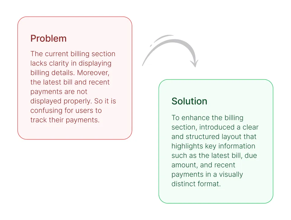 - Confusing Billing Information: The previous billing section wasn't user-friendly. Key details like the current due amount and the recent bills weren't clearly presented, which made it hard for users to understand what they owed.