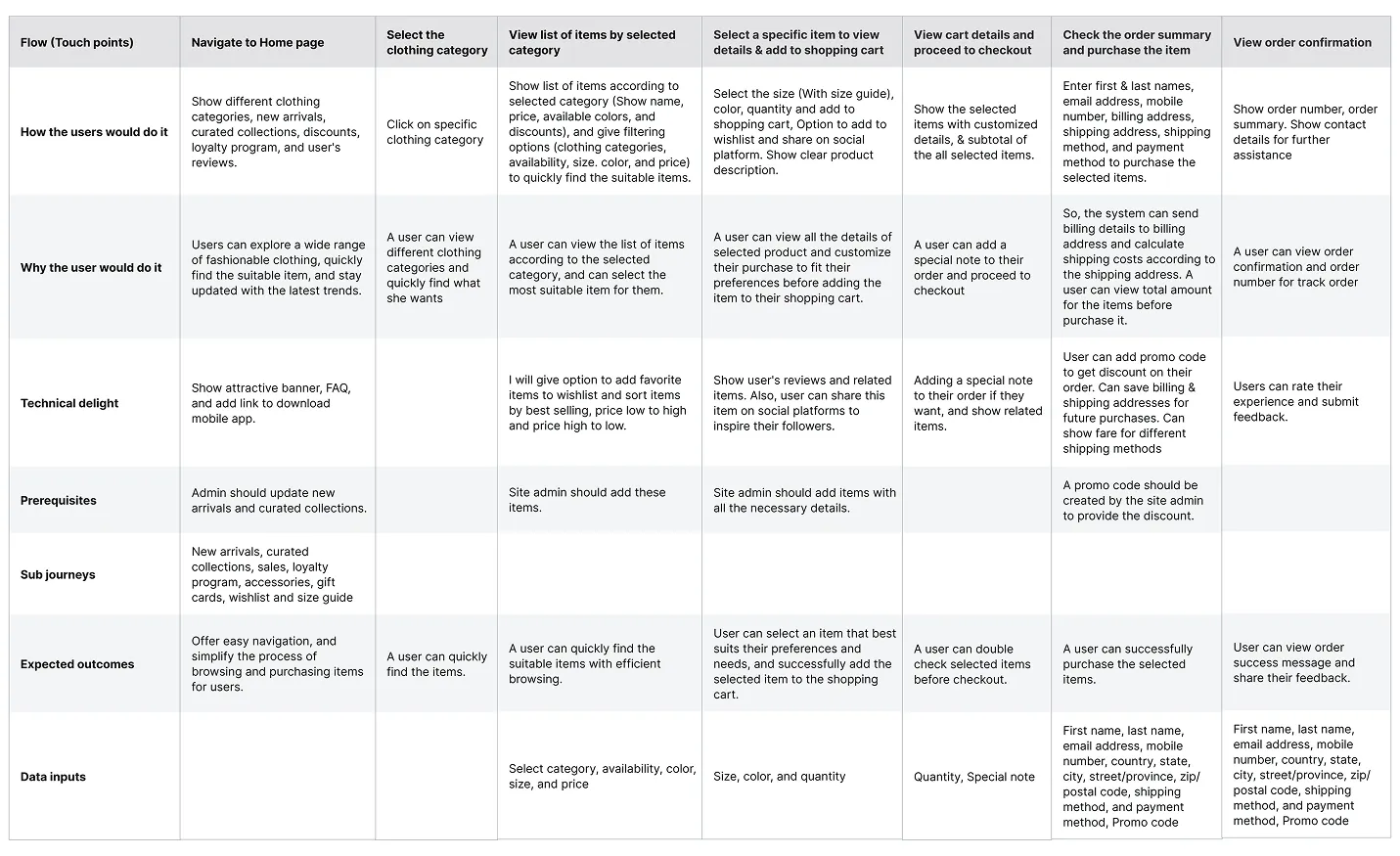 For this case study, I’m presenting one of the key user journeys from my solution blueprint. This journey highlights the touchpoints involved from browsing products to completing the purchase.
